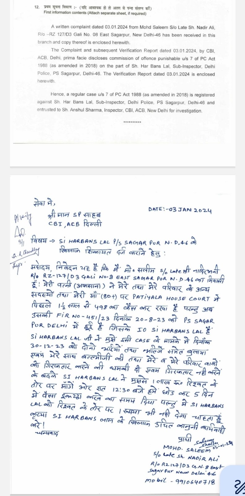 सीबीआई के अनुसार सागरपुर निवासी मोहम्मद सलीम की शिकायत पर सागर पुर थाने के सब- इंस्पेक्टर हरबंस लाल के ख़िलाफ़ मामला दर्ज किया गया।