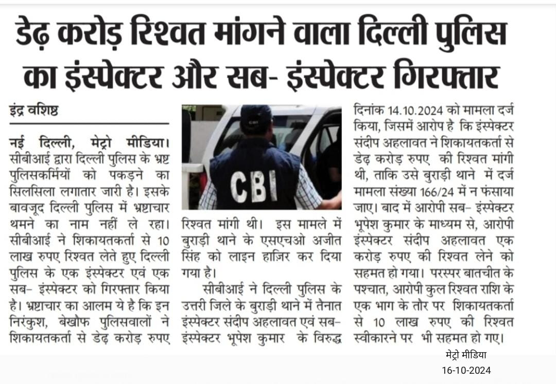सीबीआई ने 15 अक्टूबर को शिकायतकर्ता से 10 लाख रुपए रिश्वत लेते हुए बुराड़ी थाने के इंस्पेक्टर संदीप अहलावत एवं सब- इंस्पेक्टर भूपेश कुमार को गिरफ्तार किया था। भ्रष्टाचार का आलम ये है कि इन निरंकुश, बेखौफ पुलिसवालों ने शिकायतकर्ता से डेढ़ करोड़ रुपए रिश्वत मांगी थी।