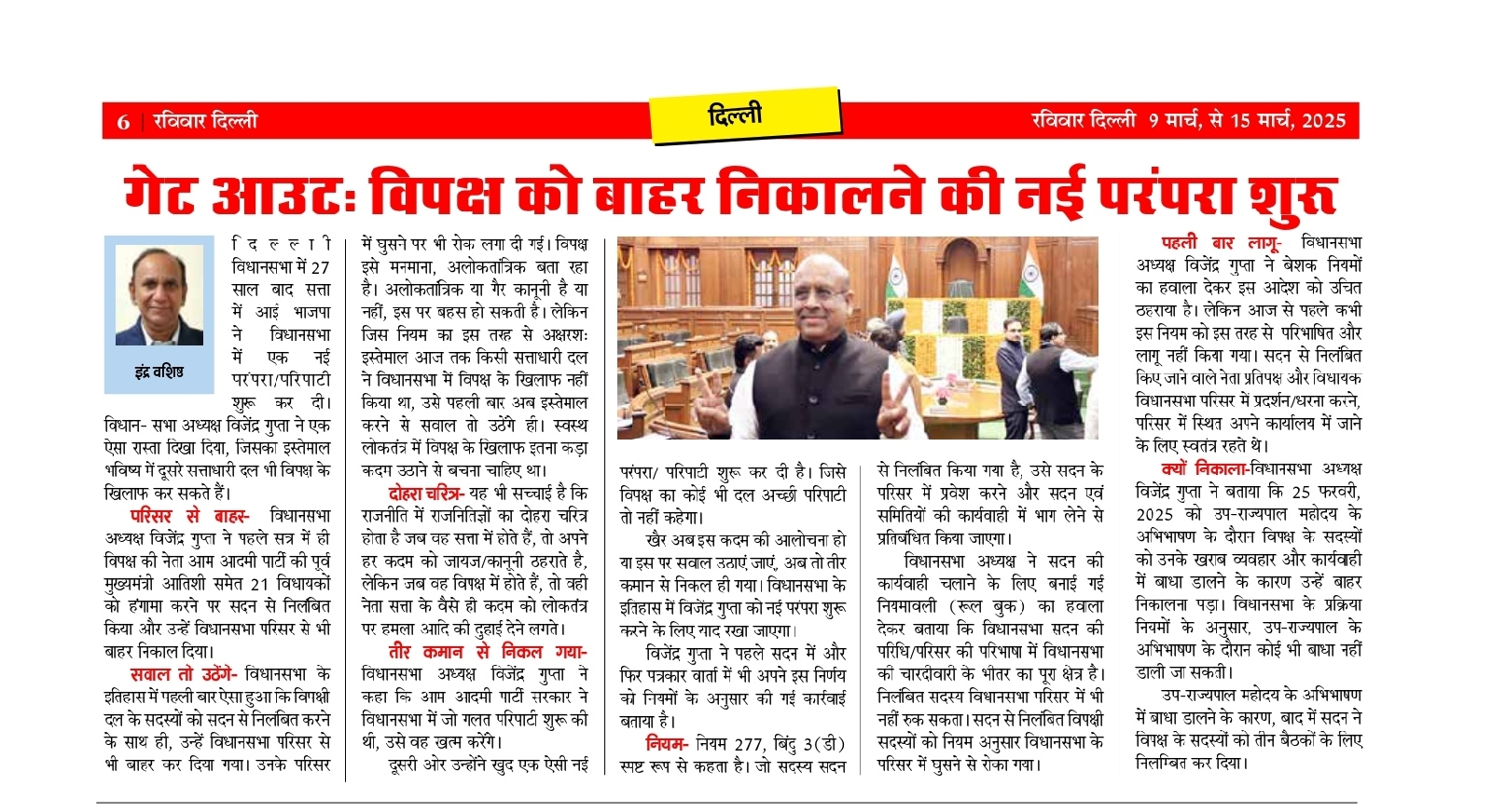 क्यों निकाला-विधानसभा अध्यक्ष विजेंद्र गुप्ता ने बताया कि 25 फरवरी, 2025 को उप-राज्यपाल महोदय के अभिभाषण के दौरान विपक्ष के सदस्यों को उनके खराब व्यवहार और कार्यवाही में बाधा डालने के कारण उन्हें बाहर निकालना पड़ा। विधानसभा के प्रक्रिया नियमों के अनुसार, उप-राज्यपाल के अभिभाषण के दौरान कोई भी बाधा नहीं डाली जा सकती।